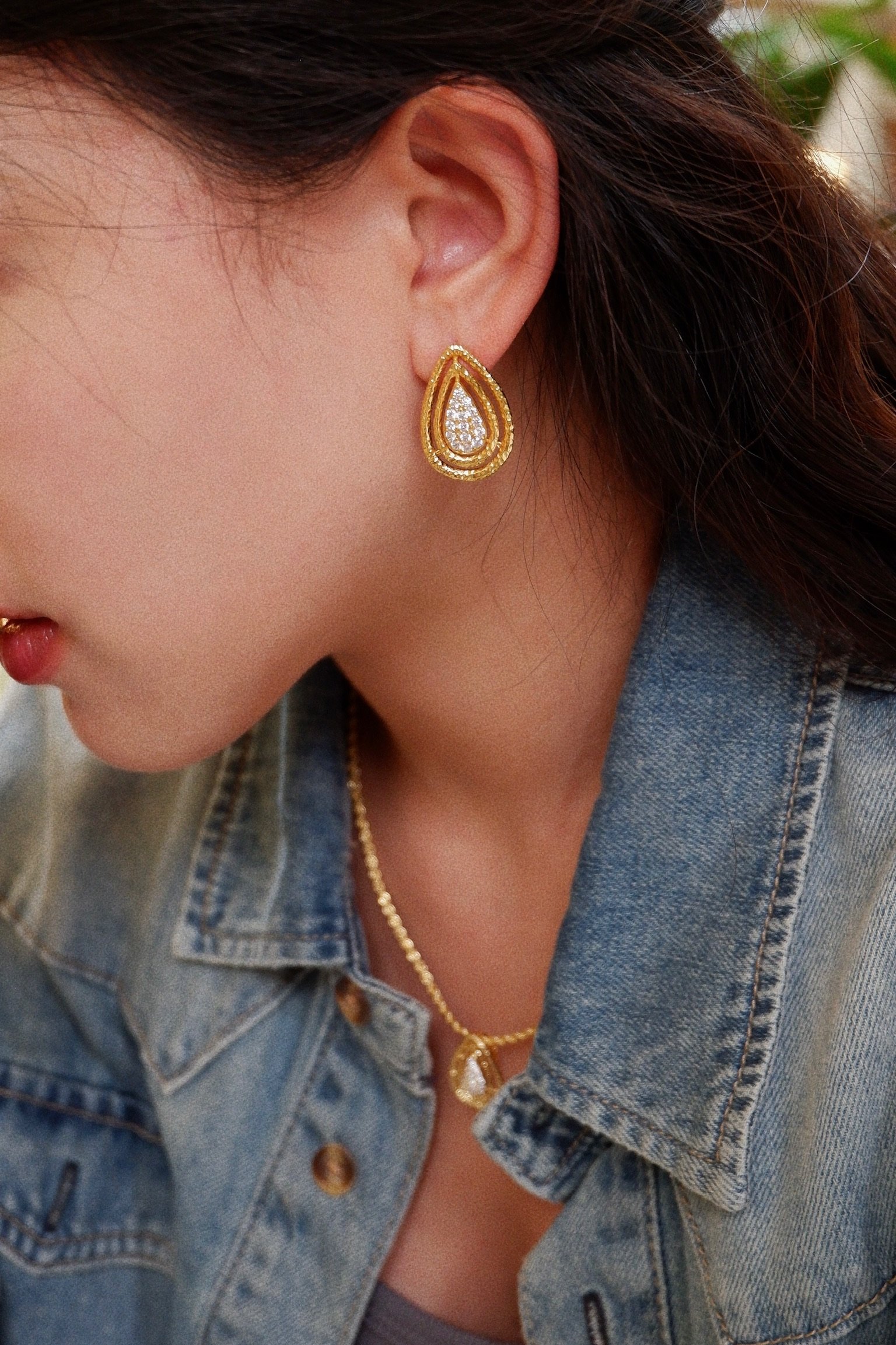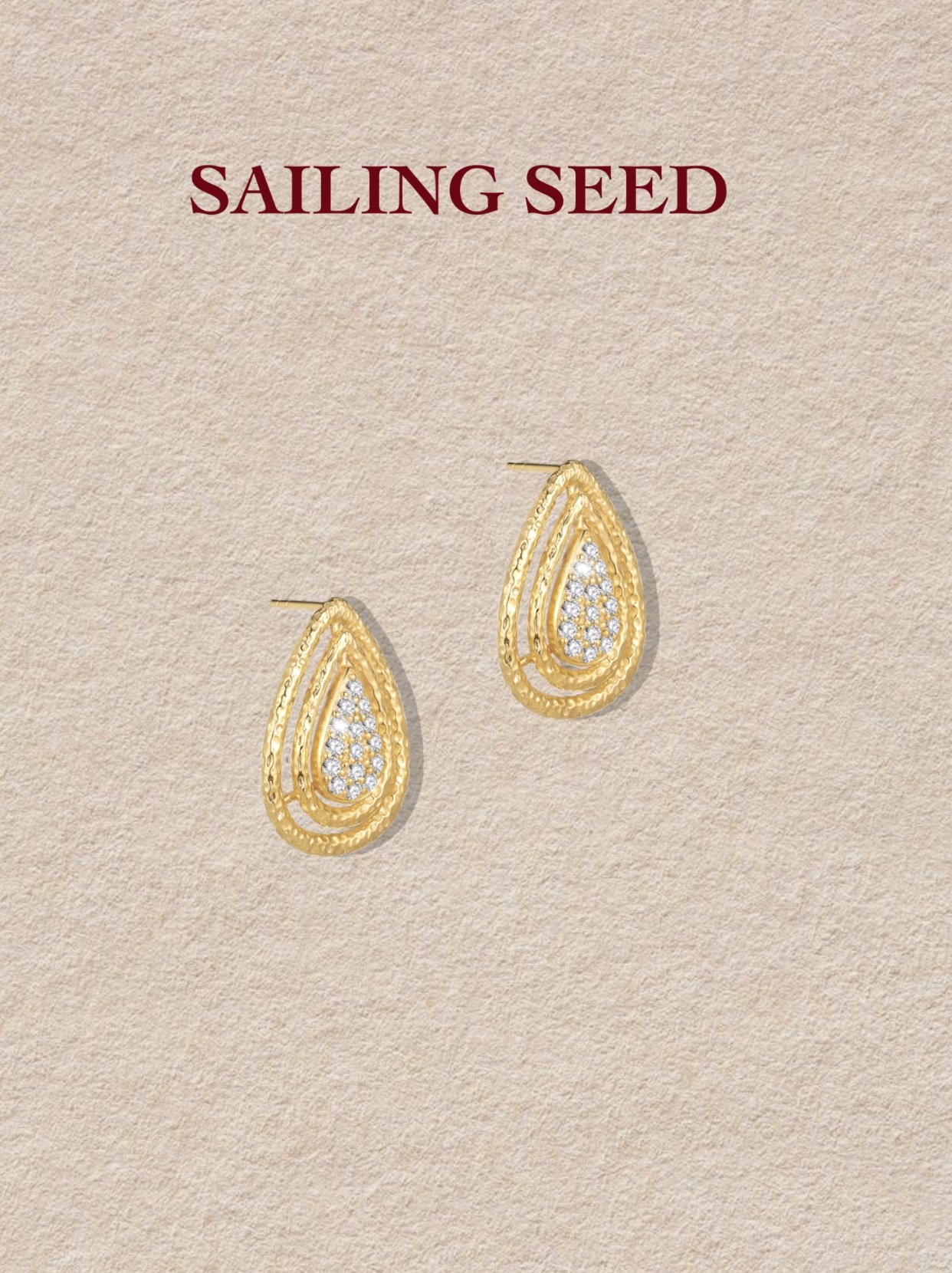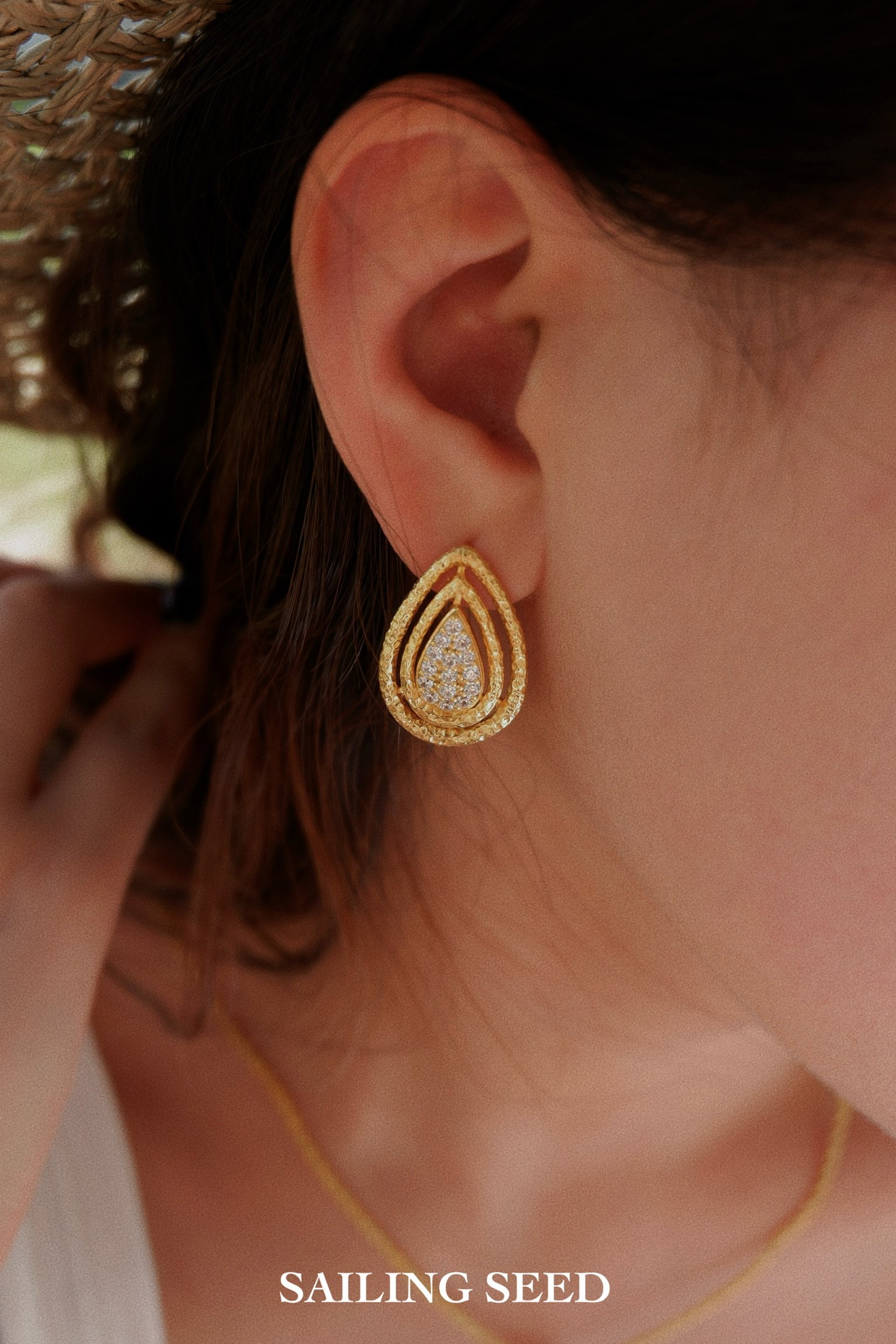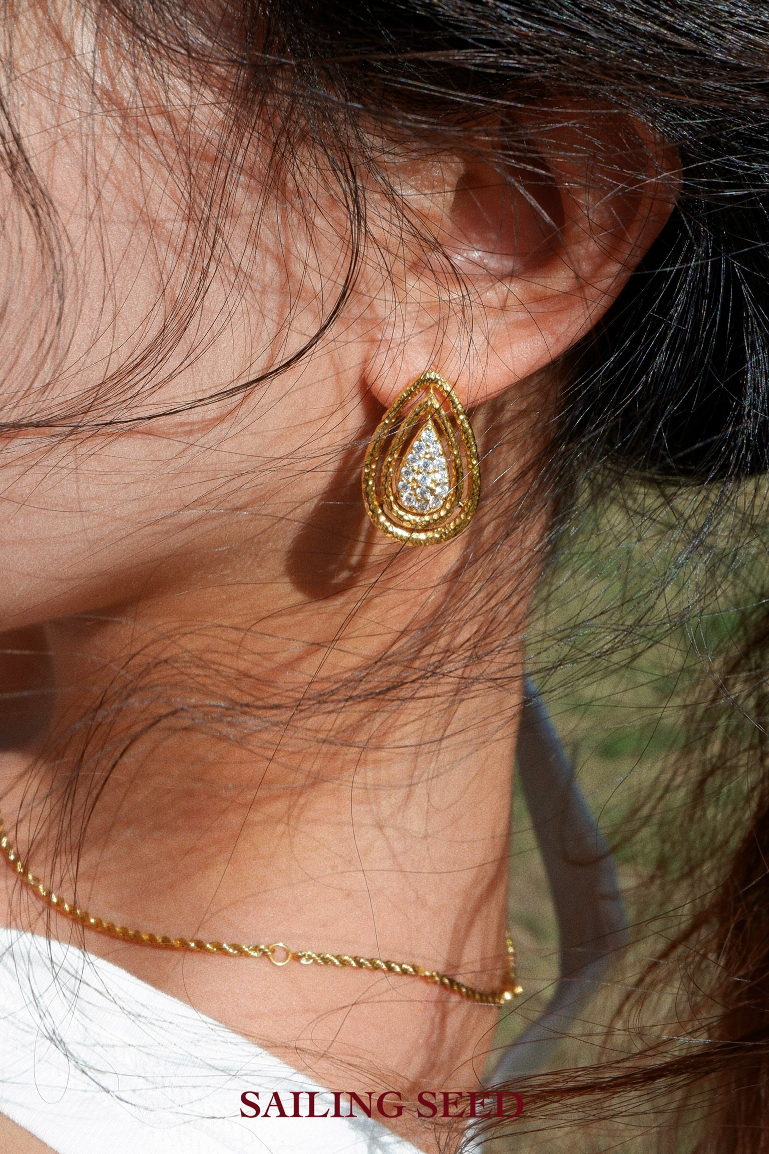 Crafted by Sailing Seed with original design, these Tide Mark gold teardrop stud earrings redefine elegant women’s jewelry. Featuring a three-dimensional teardrop silhouette with inlaid diamonds, they blend the softness of water-inspired design with the luxury of gold, making them a standout piece for daily wear, office looks, or special occasions.